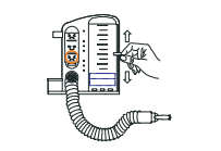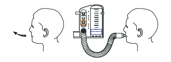 3. Inspirez lentement et profondément, l'appareil étant en position verticale, en maintenant la bille indicatrice de débit dans la position « sourire ». Inspirez aussi profondément que possible. Lorsque vous ne pouvez plus inspirer, retenez votre respiration quelques secondes et vérifiez la hauteur atteinte par le piston. Essayez d'atteindre le niveau cible prescrit. Répétez la procédure le nombre de fois prescrit. Notez votre courbe de progression sur la fiche de suivi utilisateur.