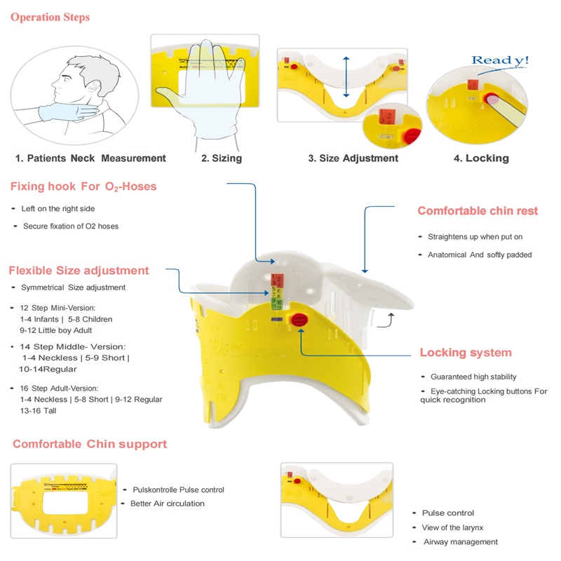 Ce collier d'extraction est un dispositif d'immobilisation rigide monobloc de la colonne cervicale conçu pour aider les sauveteurs à maintenir un alignement neutre et à empêcher les mouvements latéraux (d'un côté à l'autre) ainsi que la flexion et l'extension antéro-postérieures de la colonne cervicale pendant le transport, les soins de routine et la manipulation du patient.