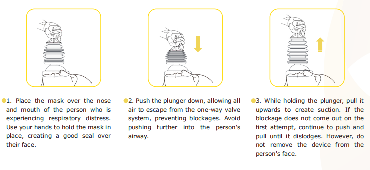 The product is mainly composed of handle, plunger, vent valve and face mask. It is a non-electric, non-invasive airway removal device designed with a special valve to prevent any air from escaping through the mask. The special valve prevents air from pushing down on food or objects. It can quickly and effectively remove the airway obstruction when the choking patient can not breathe, and save the life of the asphyxia patient.